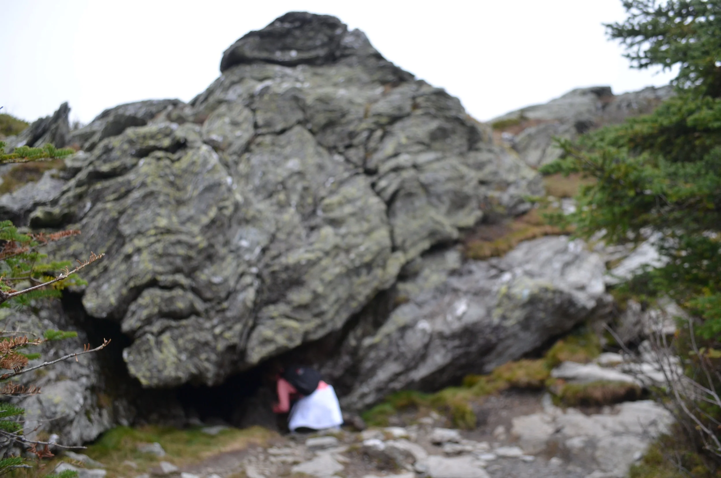 The spruces and fir trees are noticeably stunted as we reach what’s called the krummholz, when trees and shrubs become deformed due to the severe weather conditions they’re exposed to. This typically occurs over 3,000 feet. “William Whitman Bailey in New England Wild Flowers (1897) described this “the dwarf forest, the little weird, ancient, gnome-like woods; trees to delight Doré, they are so full of apparent action; so grotesque. They look as if they had been born old, like one of the heroes of Bab Ballads.” [Doré was a famous illustrator of fantastic subjects during the 1800s and Bab Ballads are a collection of absurd verse by W. S. Gilbert (1836-1911)].